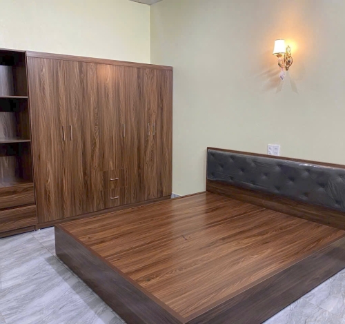 Phần bên trái là kệ trang trí + hộc kéo, tiện để đồ trang trí, sách hoặc vật dụng cá nhân.